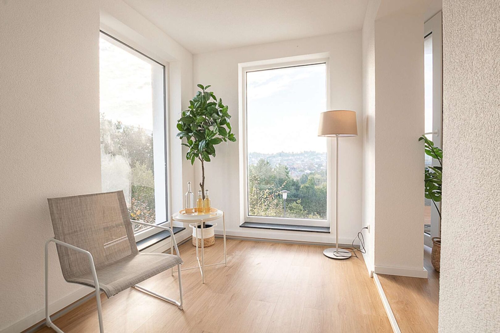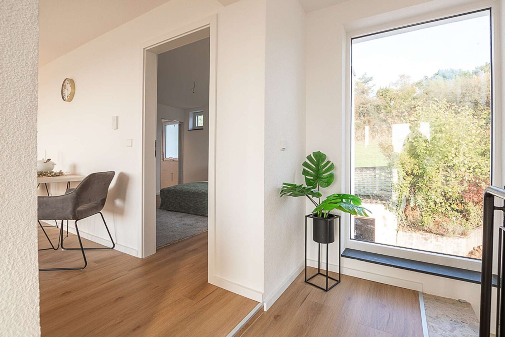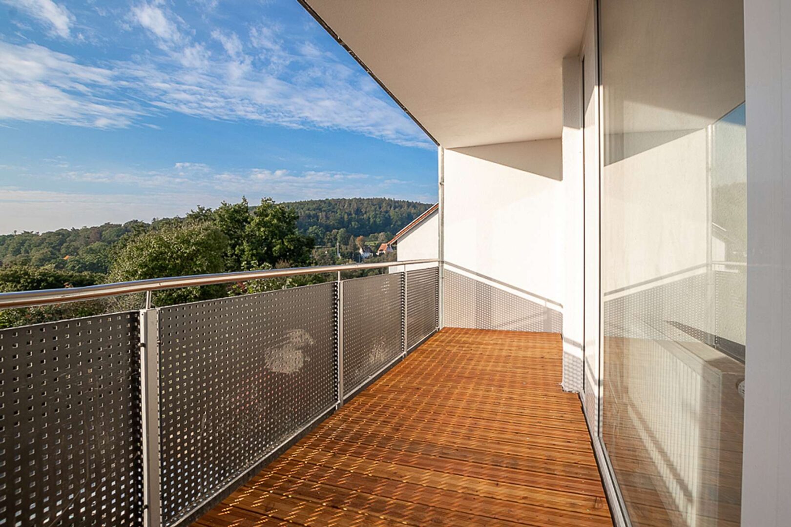 Über einen Treppenaufgang gelangen Sie von Ihrem Parkplatz zu Ihrem Hauseingang. Nach dem Betreten Ihrer Wohnung befinden Sie sich im lichtdurchfluteten Treppenhaus. Vom Erdgeschoss gelangen Sie in zwei Zimmer (Durchbruch zu einem großem Zimmer ist bei Wunsch unproblematisch umsetzbar) mit jeweiligem Balkonzugang. Der Balkon hat einen Echtholzboden und bietet Ihnen einen großartigen Weitblick auf Bad Salzschlirf und ins Grüne.