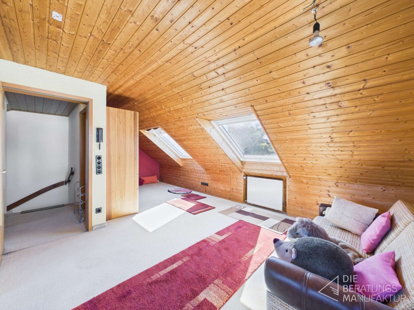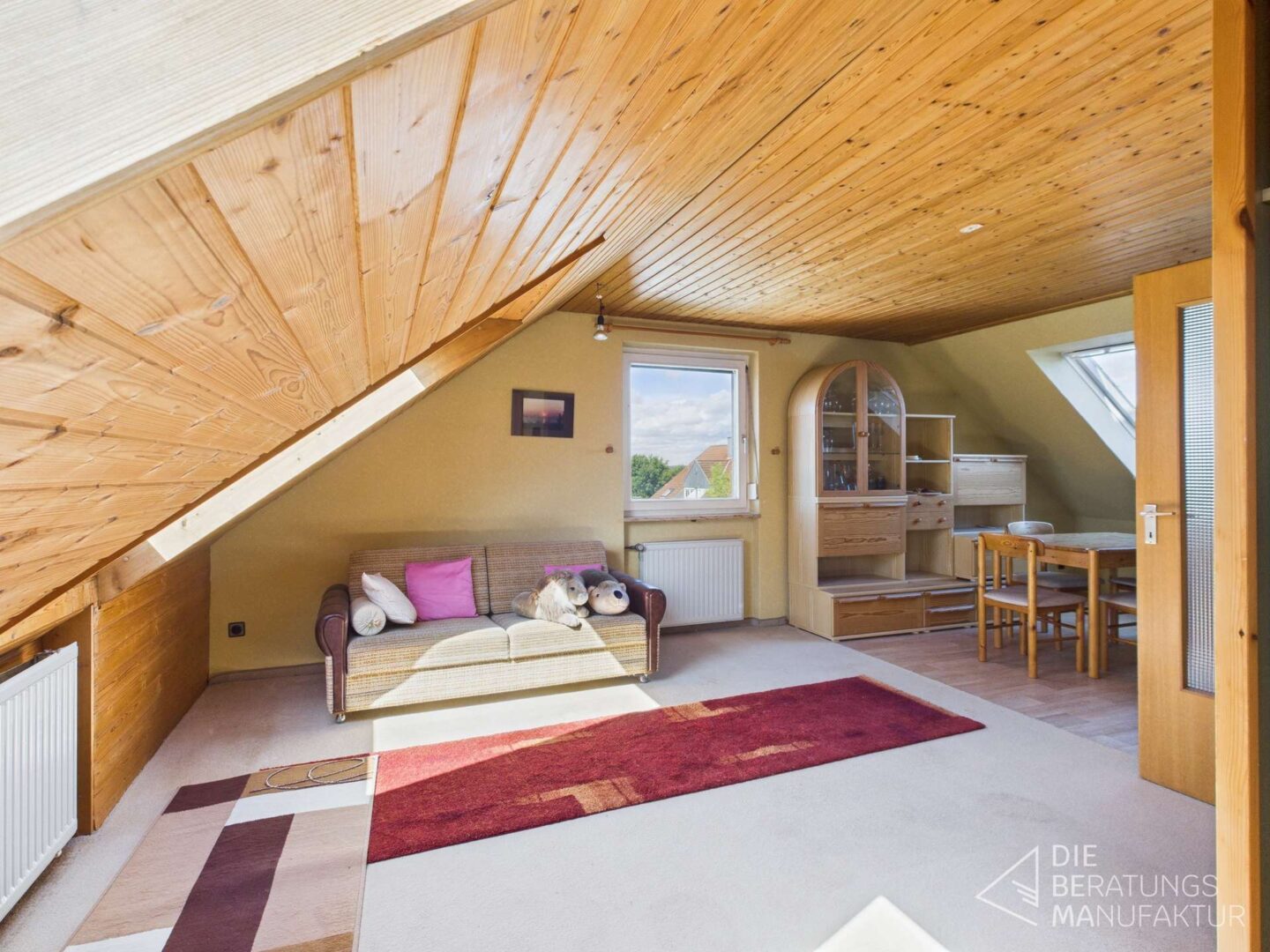 Das massiv gebaute Haus verfügt über ein ausgebautes Dach mit Wohnraum, Küchenbereich und eigenem Badezimmer, einen Vollkeller und eine Doppelgarage. Es bietet mehrere Schlafzimmer, Bad mit Wanne und ein separates Gäste WC im Erdgeschoss. Die Beheizung erfolgt über eine Öl-Zentralheizung.