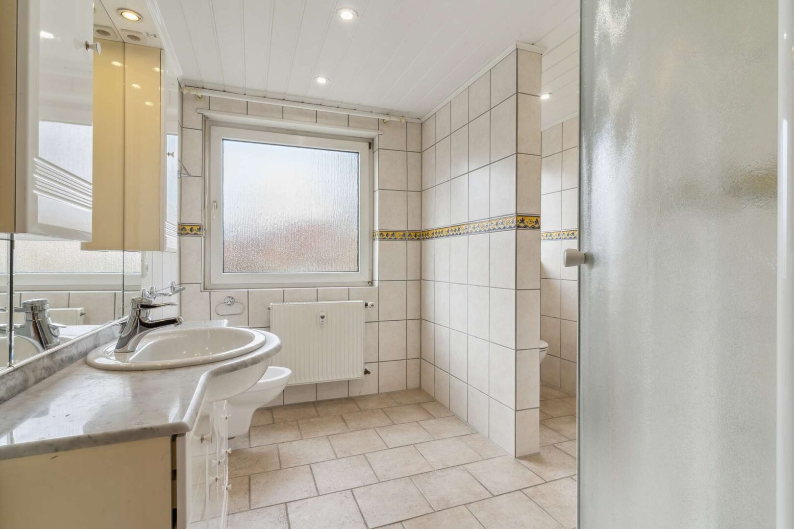 Ihr großzügiges Badezimmer liegt direkt rechts neben Ihrer Wohnungseingangstür. Auch hier wurde auf viel Schnickschnack verzichtet und funktional gedacht. Die Toilette und ein Urinal wurden mittels einer Zwischenwand separiert, Ihre Privatsphäre wird somit gewahrt, auch wenn Sie mal nicht allein im Badezimmer sind. Ein Einbauschrank bietet neben dem großen Waschtisch-Unterbau zusätzlichen Stauraum für Handtücher, Badeutensilien oder auch Reinigungsprodukte. Kern des Badezimmers ist die große halbrunde Dusche, die Ihnen absolute Bewegungsfreiheit bietet. Auch das Integrieren einer Badewanne ist aufgrund der Größe des Raumes nachträglich möglich, denn Sie verlieren keinen Platz durch das Stellen einer Waschmaschine. Diese findet Ihren Platz in einem Hauswirtschaftsraum, den Sie gemeinschaftlich nutzen können. Zu erreichen ist dieser über einen Zugang, der sich direkt neben Ihrer Wohnungseingangstür befindet. In diesem abgeteilten Bereich finden Sie auch einen kleinen Kellerraum, der Ihnen zum Unterbringen weiteren Hausrates zur Verfügung steht.