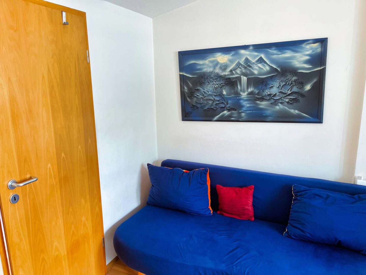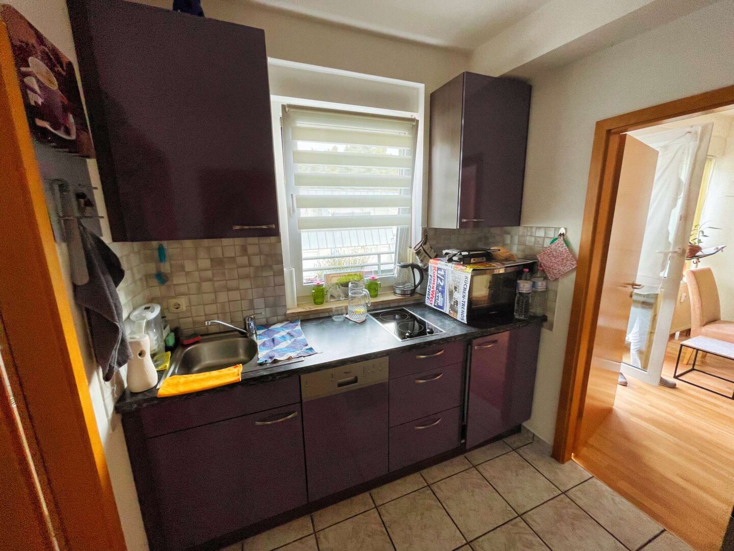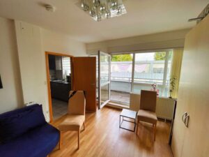 Das gemütliche Wohnzimmer bietet Zugang zu einer großzügigen Terrasse und zu einem abgetrennten Schlafbereich. Zur Wohnung gehörten zudem eine Einbauküche und ein möbliertes Bad mit Dusche und Fenster. Zusätzlich sind alle Fenster mit Rollläden ausgestattet.