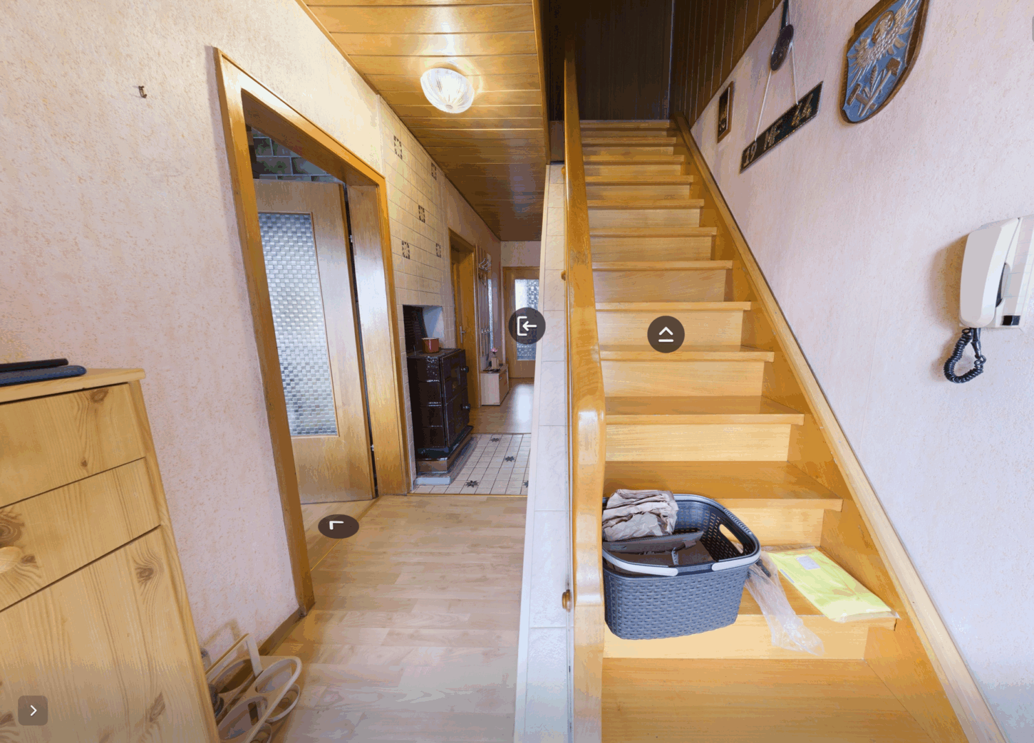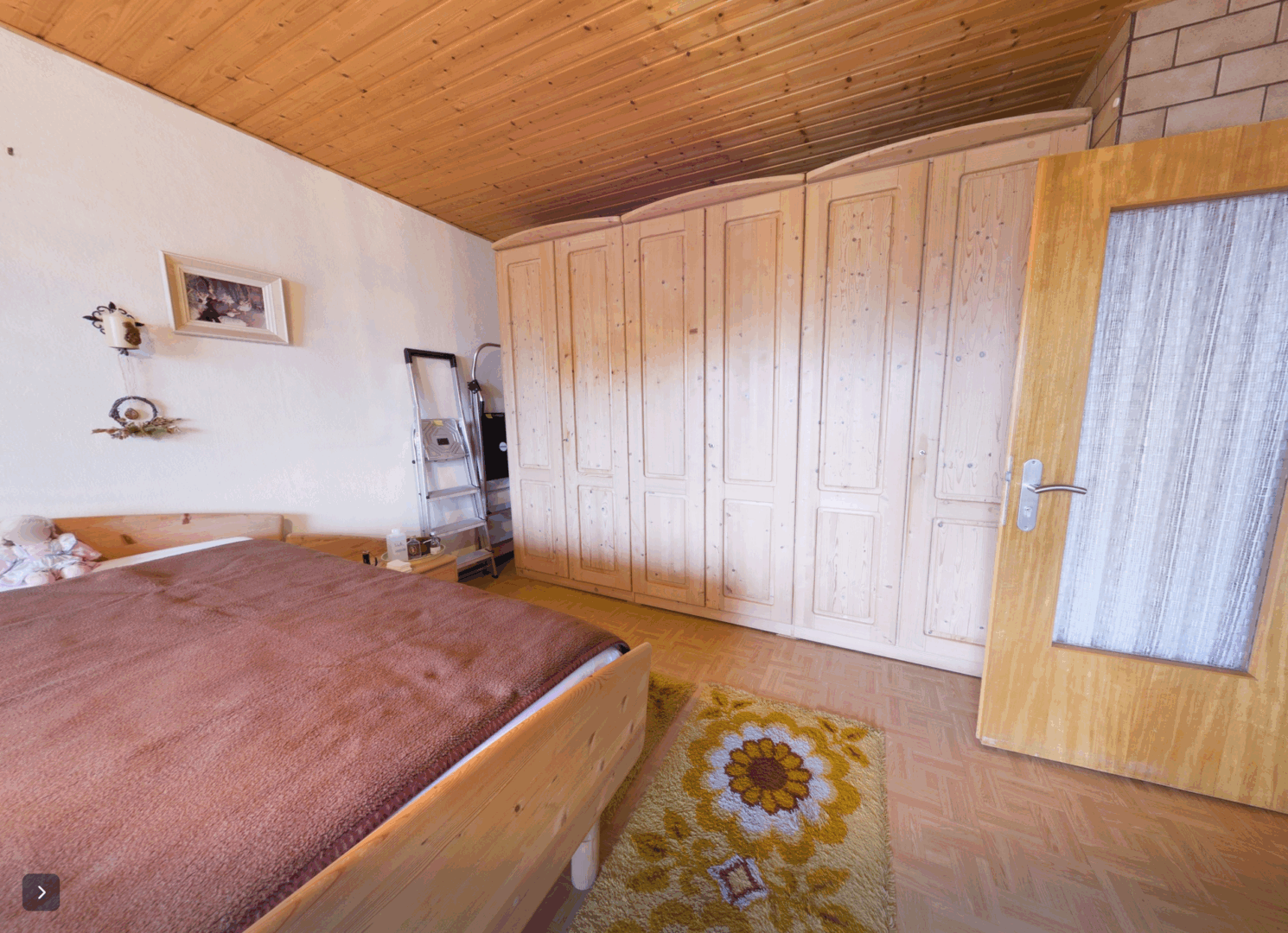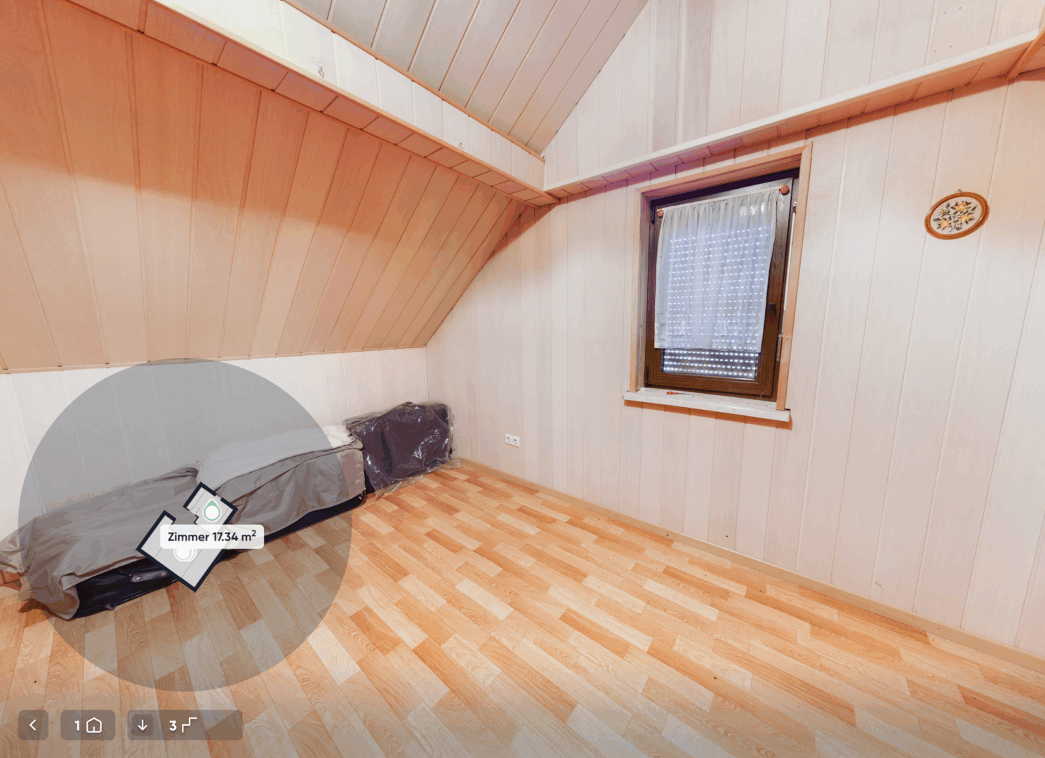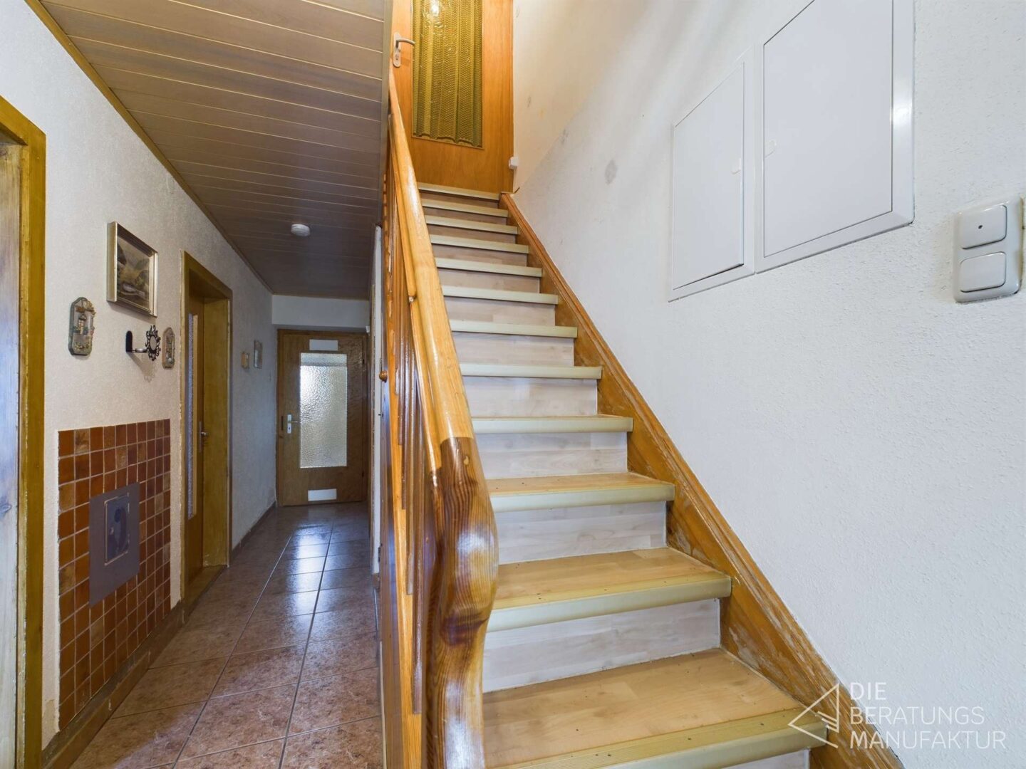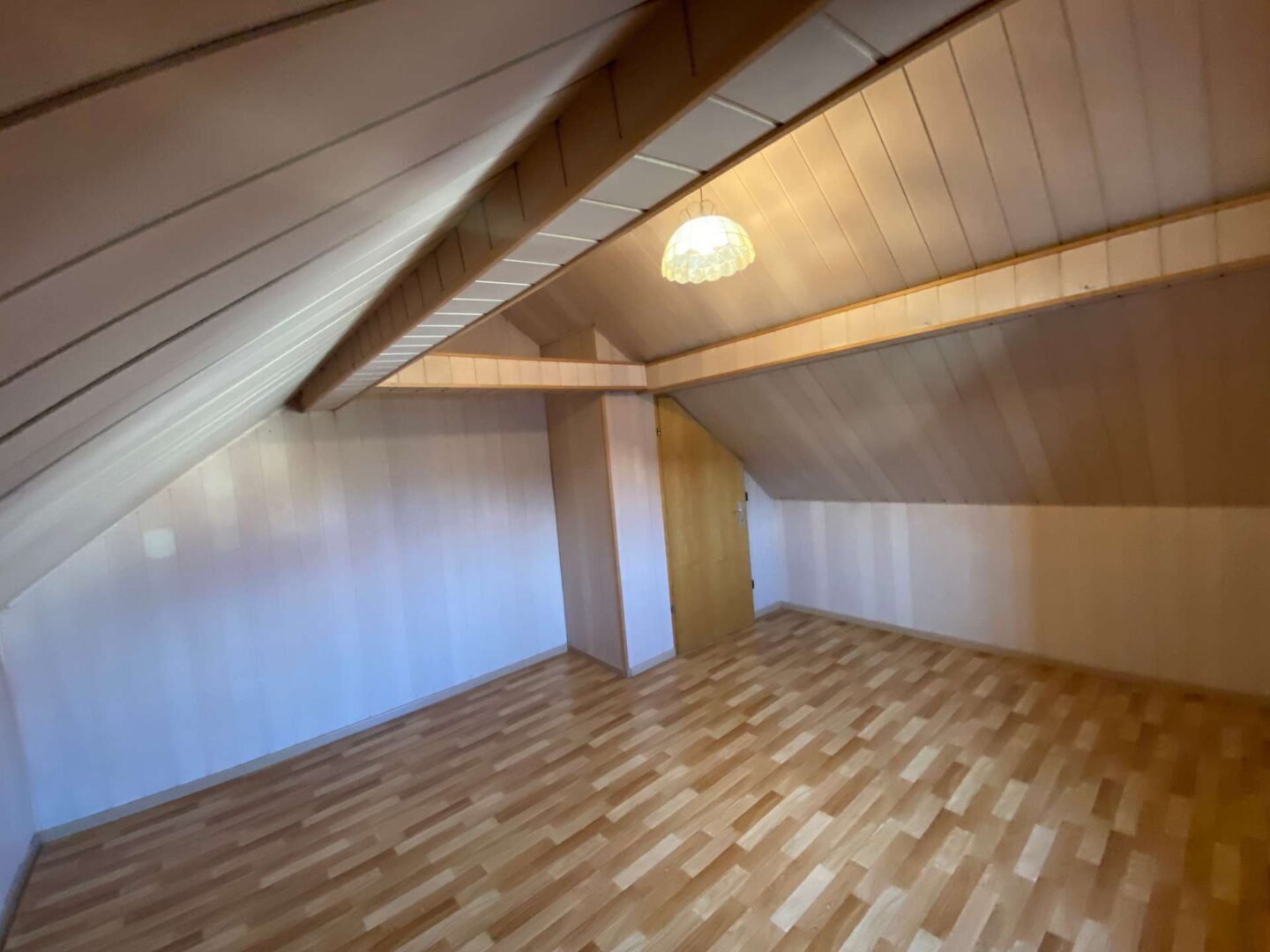 Über die offene, schöne Treppe im Erdgeschoss gelangen Sie in den nächsten Stock und das Dach. Im Dachgeschoss wurde bereits ein Zimmer ausgebaut; es eignet sich gut für Übernachtungsgäste. Den übrigen noch nicht ausgebauten Teil des Daches können Sie nach Ihrer Fantasie gestalten.