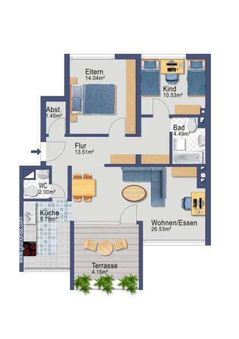 Modern geschnitten präsentiert sich die Wohnung mit einer großzügigen Balkonterrasse, einem großen Wohnbereich, besonders hellen Schlafzimmer und einem Kinder- oder Arbeitszimmer, sowie einer schönen Küche.