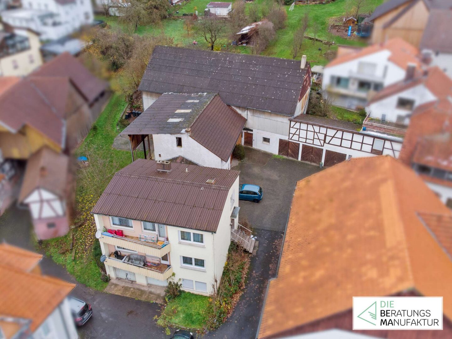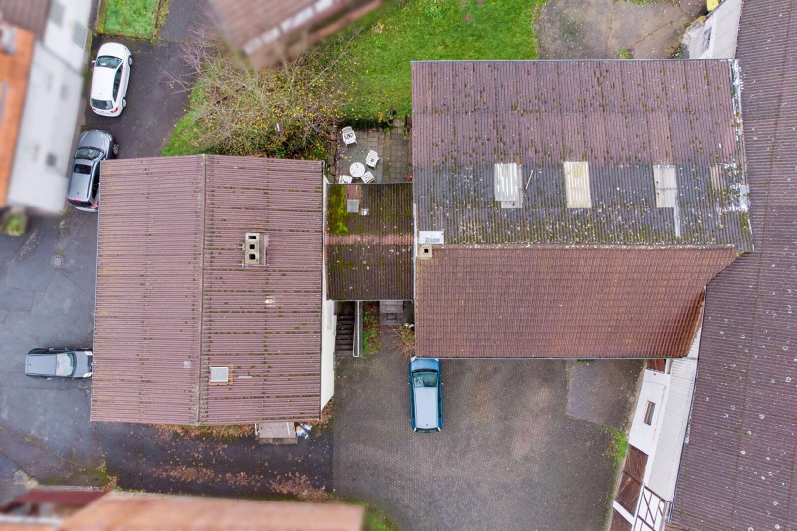 Zum letzten Teil der Außenanlage zählen drei Garagen, die Ihnen weitere überdachte und geschützte Stellplatze bieten und den Gebäudetrakt abschließen. Die Dächer der Nebengebäude sind mit Eternitplatten eingedeckt.
