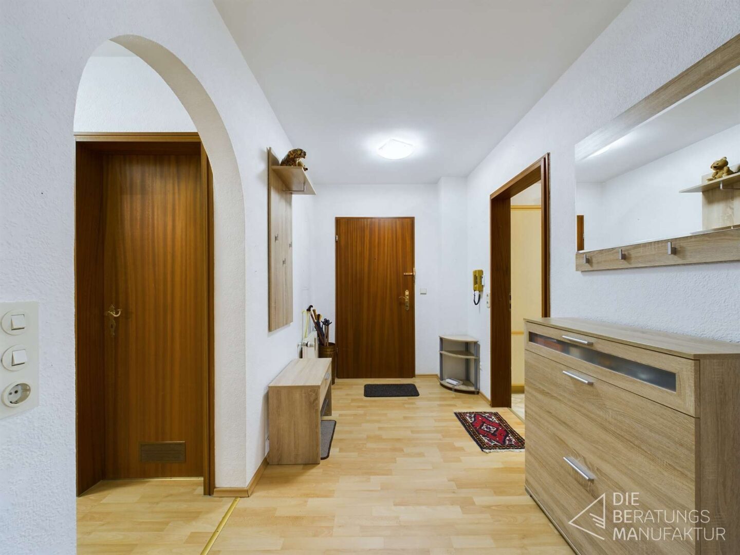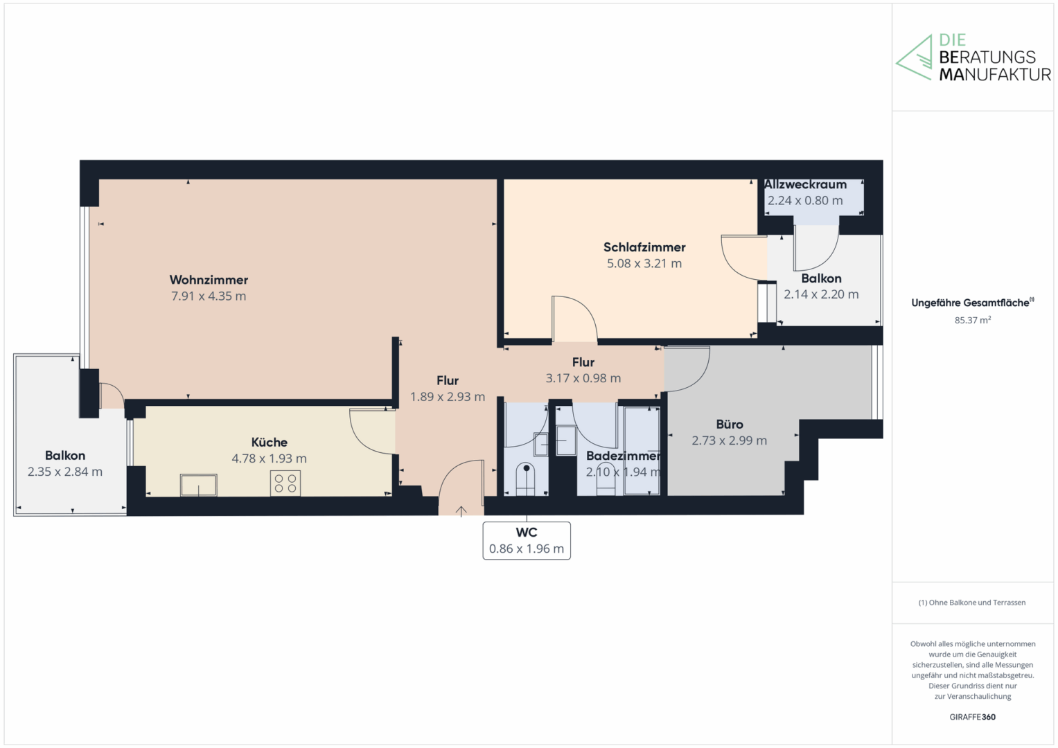 Das Raumangebot umfasst Diele, Küche, Bad mit Badewanne, Gäste WC, Büro, Schlafzimmer mit Balkon (ein Allzweckraum ist dort auch vorhanden), sowie Wohn-/Esszimmer mit Zugang zum 2.Balkon.